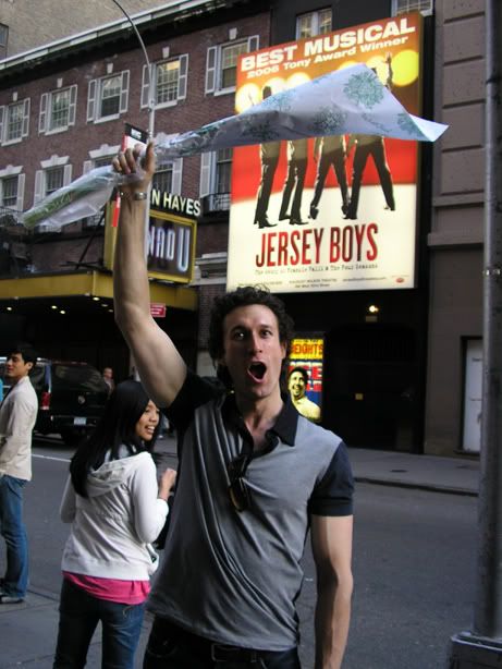 Sunday dawned bright and early and then we went back to sleep. And woke up two hours before check-out time--yay laziness! We got out of there with reasonable speed and drove to Hoboken, land of parking, PATH stations, and less dodginess than Newark. Did not get there in time to greet anyone before the show, as we were busy walking up to the florist on 51st so Jenn could buy flowers for Aaron. (Yes, we are dorks.) Probably just as well that we missed pre-show stage door, since the flowers might have led to a few odd looks.
